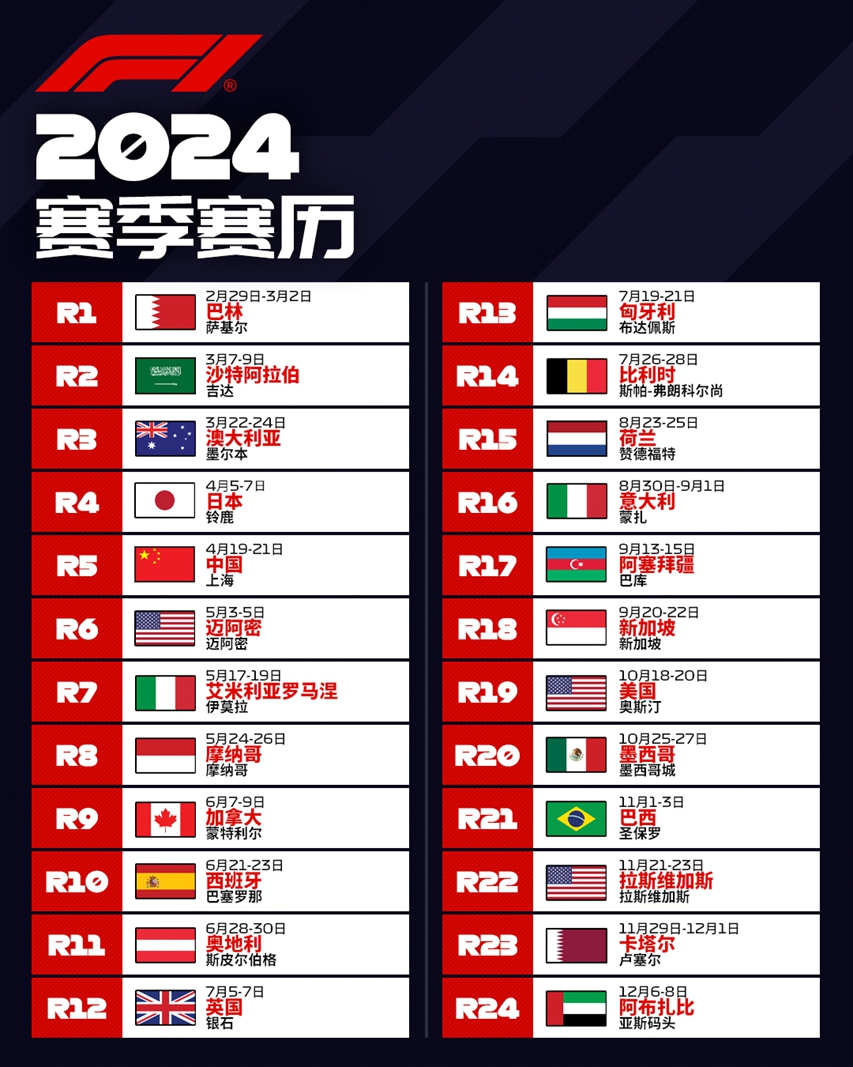 【YourDomains · 你的域名】从F1官方获悉,2024 F1赛历赛程如下: